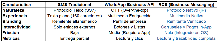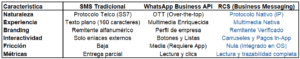 Tú estás aquí: Inicio / Blog / RCS: La disrupción del Owned Media y su orquestación estratégica con Paid Media / SMS vs. WhatsApp Business vs. RCS